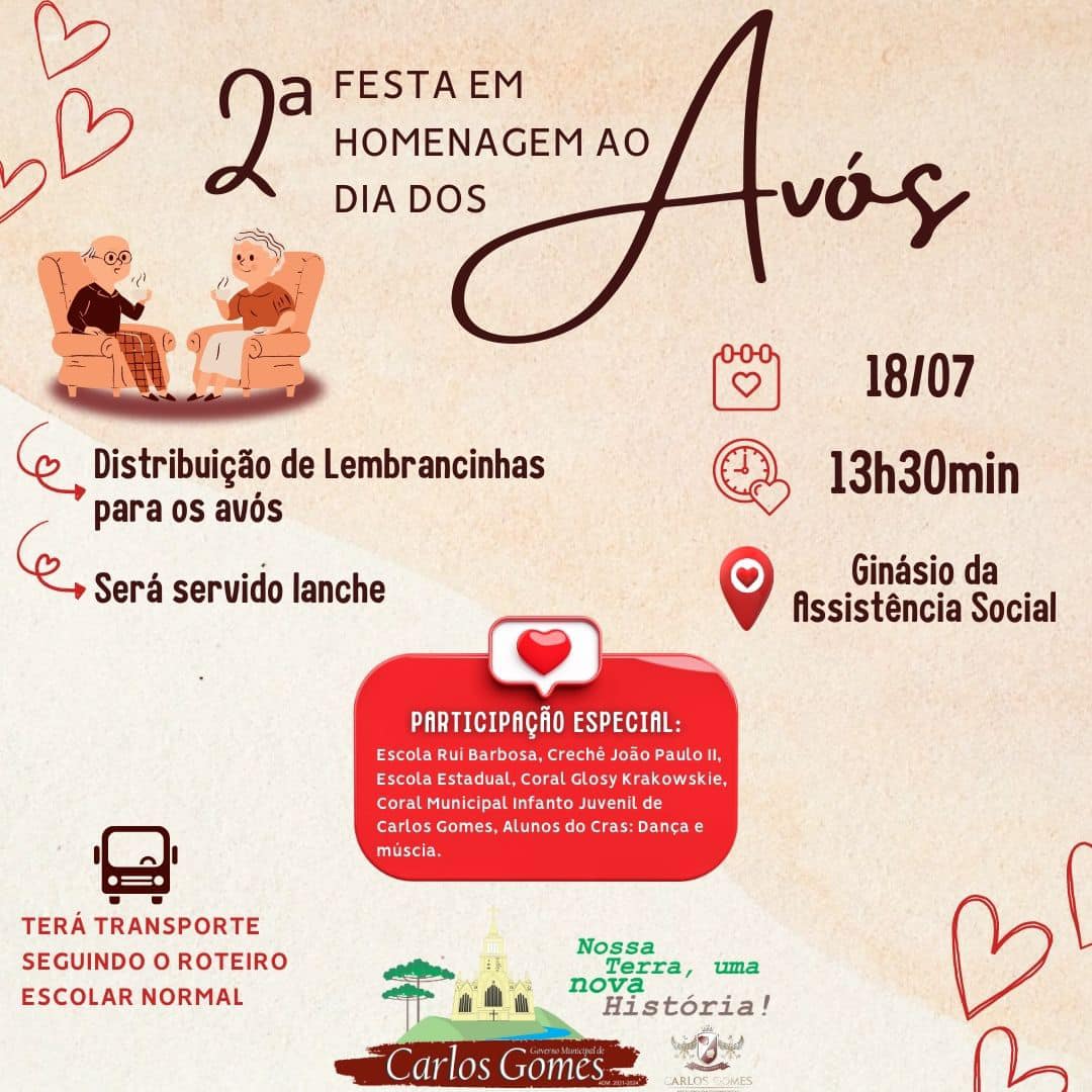 A Administração Municipal de Carlos Gomes convida a todos os avós do nosso município para participar da 2ª Festa em homenagem ao seu dia. O evento será realizado no dia 18 de julho, às 13h30min no Ginásio da Assistência Social.