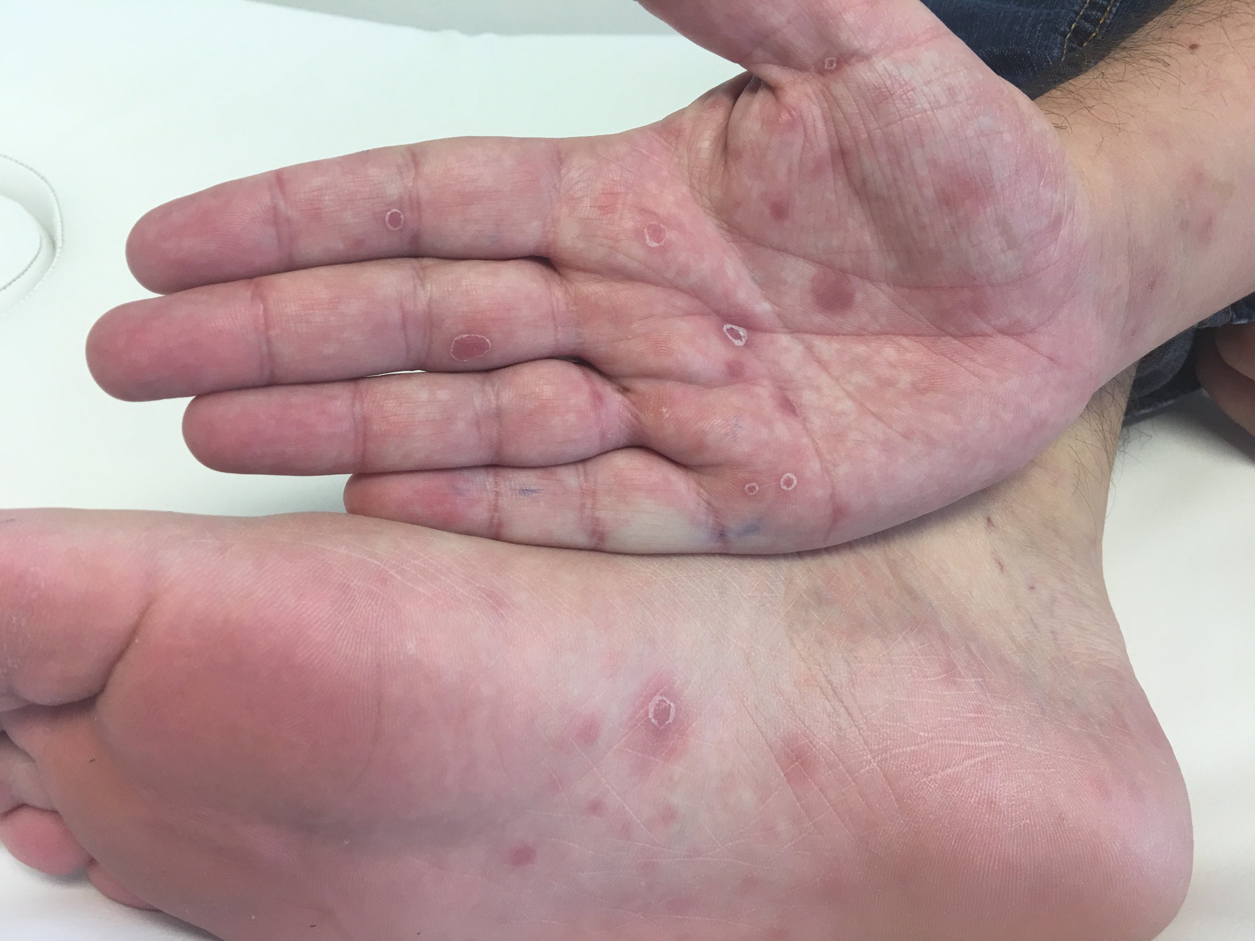 A sífilis secundária acontece cerca de duas a oito semanas após as primeiras feridas se formarem. Aproximadamente 33% daqueles que não trataram a sífilis primária desenvolvem o segundo estágio. O paciente pode apresentar vermelhidão pelo corpo (exantema), coceira, aparecimento de íngua (gânglios inchados) nas axilas e pescoço.