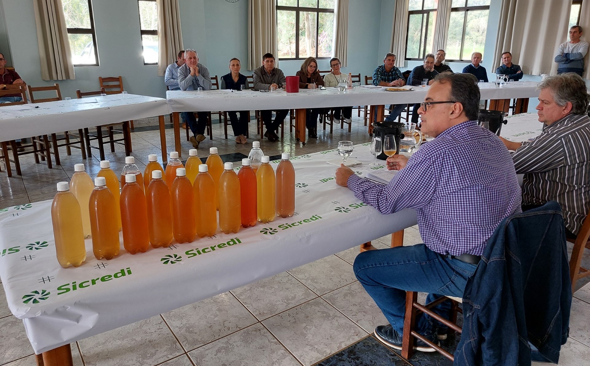 Na parte da manhã, foi realizada uma capacitação para uma equipe de extensionistas da Emater/RS-Ascar, ministrada pelos enólogos da Embrapa Uva e Vinho, João Carlos Tafarel e Giuliano Elias Pereira. O evento envolveu extensionistas dos municípios de Charrua, Erebango, Estação, Floriano Peixoto, Getúlio Vargas, Sertão e Ipiranga do Sul. A dinâmica, com orientações teóricas e degustação, também teve a participação do assistente técnico regional, extensionista Carlos Alberto Angonese, responsável pela área de agroindústrias na região de Erechim, e da supervisora da microrregião Fernanda Tacca Angonese. A atividade de vitivinicultura também integra uma das ações desenvolvidas pela Emater/RS-Ascar, do conjunto de programas da Secretaria do Desenvolvimento Rural (SDR).