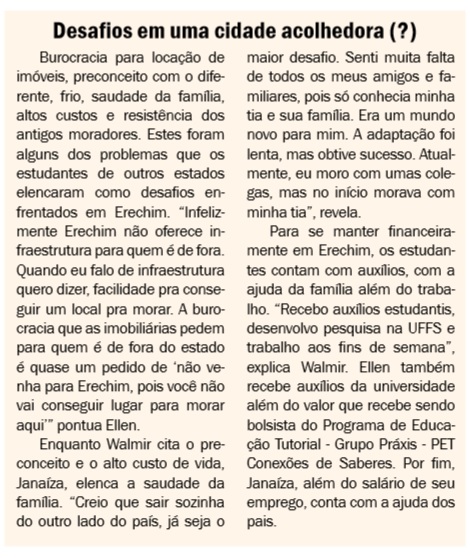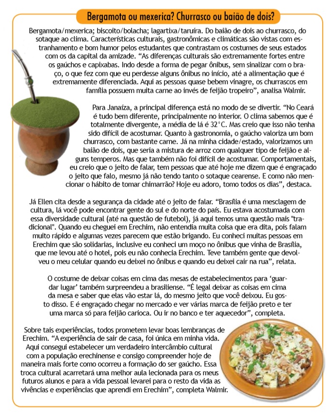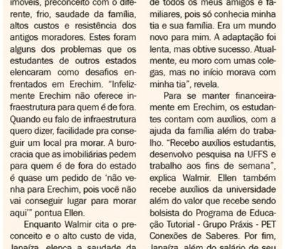 Além de Walmir, a reportagem do Jornal Bom Dia procurou outras duas jovens – Janaíza Alves e Ellen Nascimento da Silva - que mudaram-se de seus estados para estudar em Erechim. Eles falaram sobre os desafios, diferenças e aspirações na nova cidade, além da experiência de estar milhares de quilômetros distantes de casa. Em comum está o fato de todos cursarem o ensino superior, no entanto, a opção pela Capital da Amizade para morar não se deu à toa.