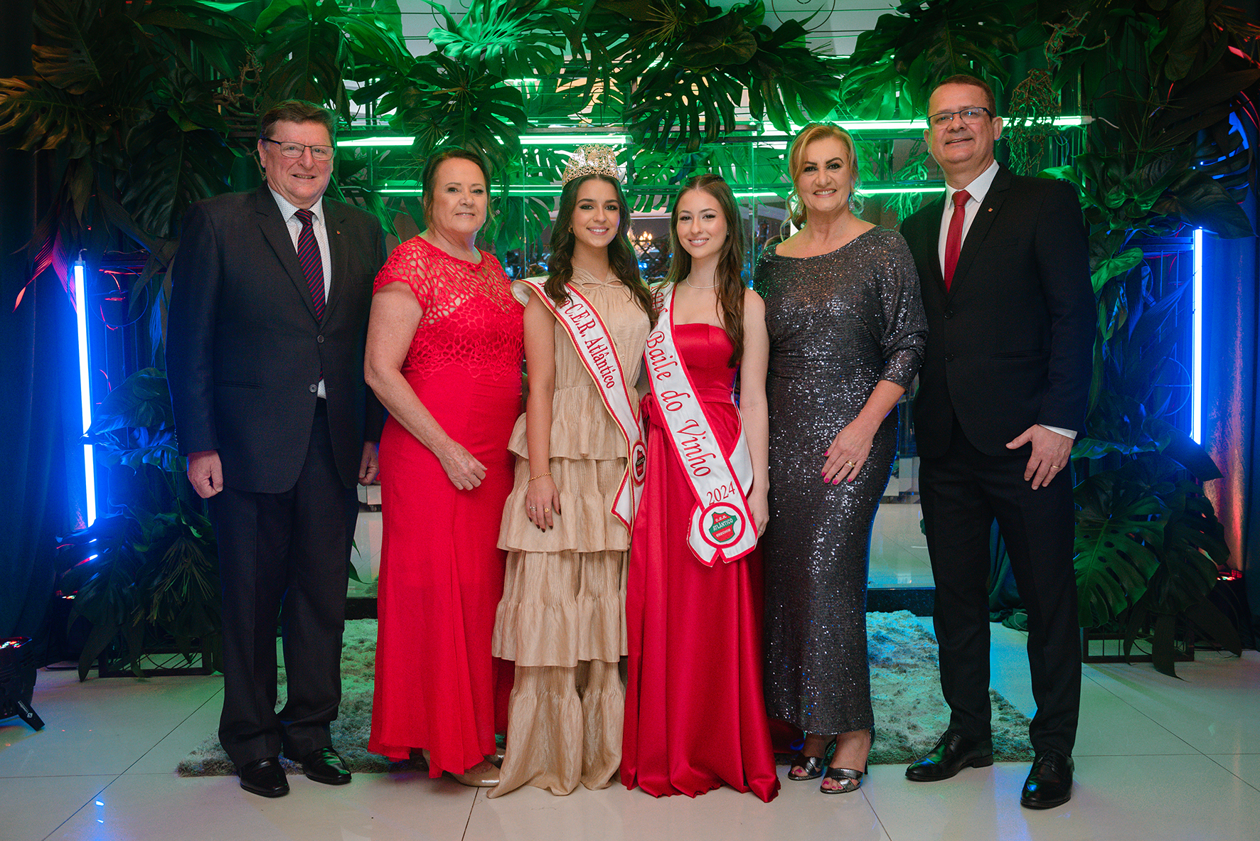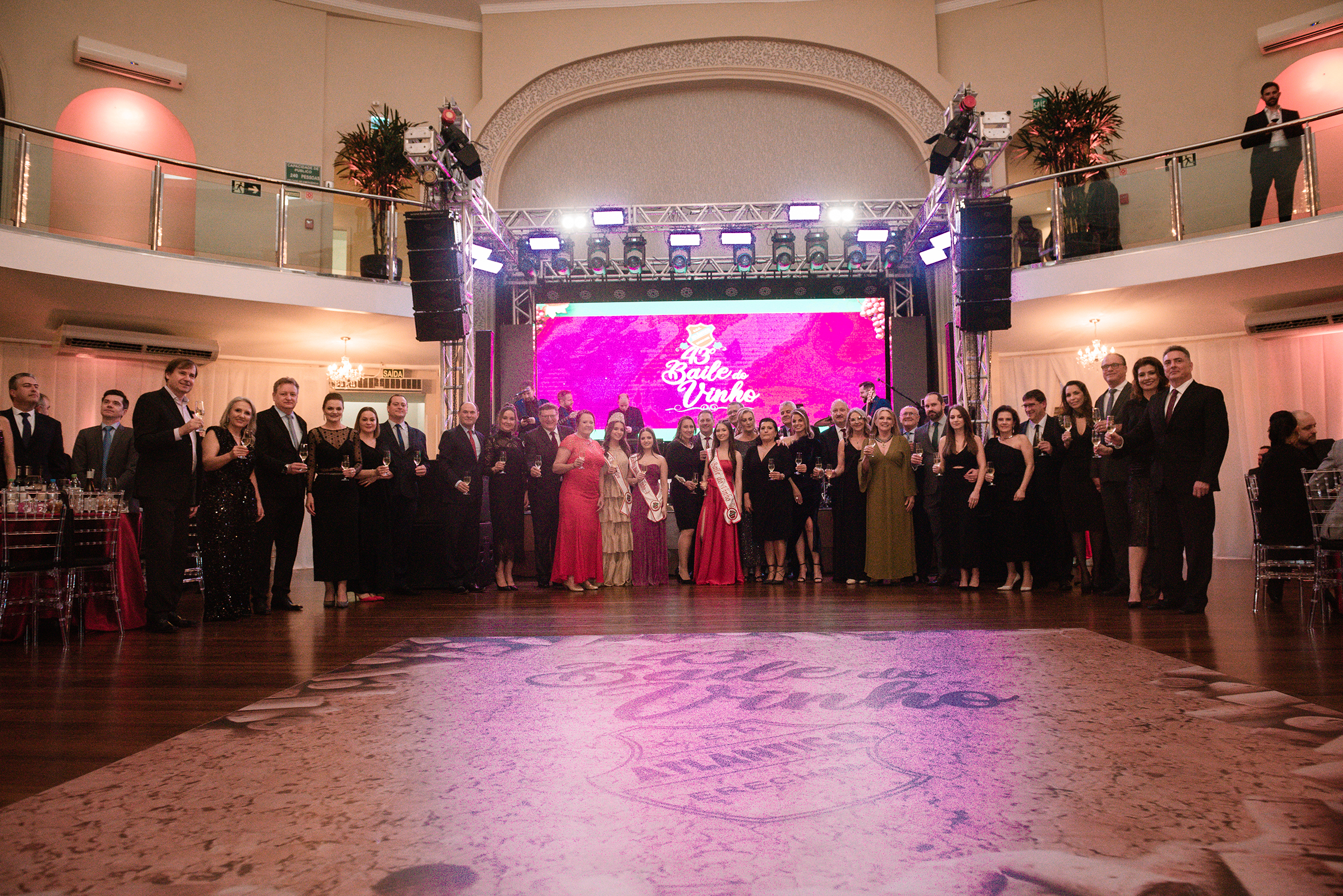 Em seguida, foi apresentada a nova Rainha do Baile do Vinho, a jovem Rafaella de Miranda Forleo Wahl, que foi conduzida até o centro do salão pelo casal vice-presidente social Lauri e Lu Pavan, recebendo a faixa de Laura Tozatti Zardo.