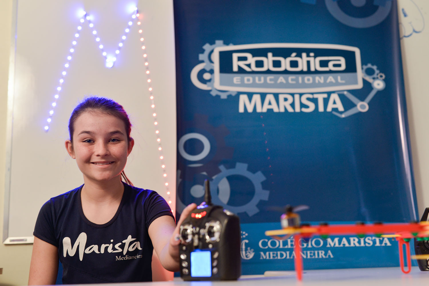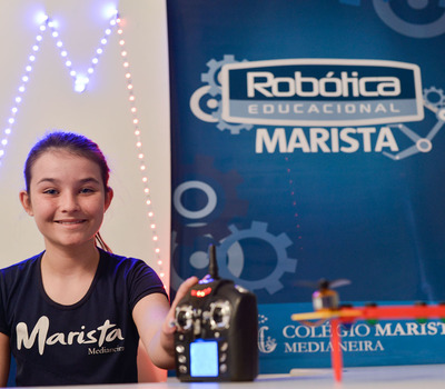 Do Colégio Marista Medianeira, 6 equipes estarão representando nossa cidade. Eles participam do Desafio de Robôs e Drones, levando um robô construído a partir de Lego.