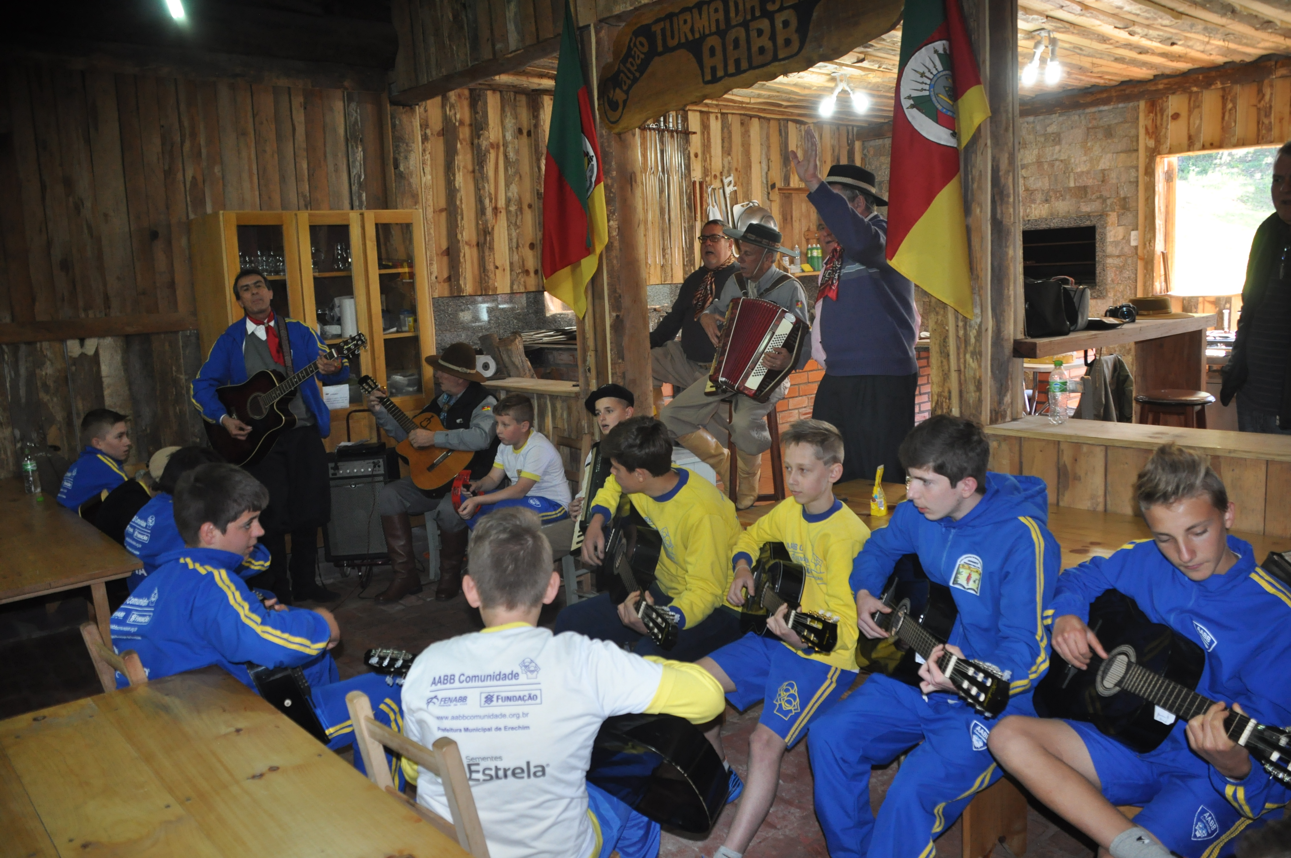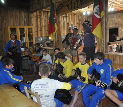 As crianças que participam do Programa Integração AABB estão vivendo em clima de tradicionalismo nesta semana. Elas participaram na tarde desta quinta-feira (15) da abertura da programação do Galpão da AABB. No momento, os estudantes que participam da oficina de música oferecida pelo programa nas quintas-feiras puderam mostrar o que estão aprendendo. Junto com o professor Julio Cezar Xavier dos Santos eles tocaram e cantaram várias músicas, desde o hino do RS, passando pelo clássico Querência Amada e por canções como “Que Beijinho Doce”, “Moreninha Linda” e “Panela Velha.