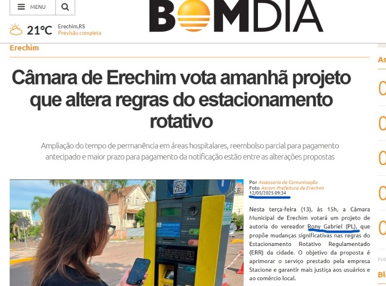 O tema do projeto, é de extrema importância para toda a comunidade, e sempre foi pauta dos veículos de comunicação do Grupo Bom Dia de Comunicação, o estacionamento rotativo pago de Erechim, que tem um modelo, que constantemente é questionado pela população. E esse projeto corrige algumas das distorções elencadas pelos usuários.