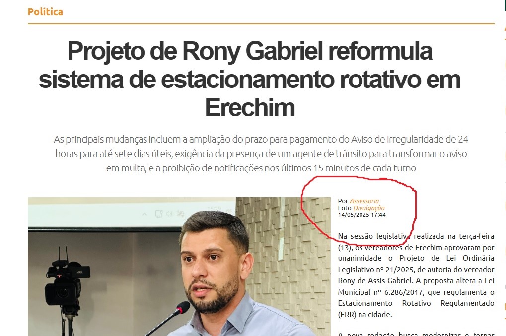 Na manhã de ontem, 15, retornei ao trabalho após alguns dias afastado, me recuperando da Influenza, e um dos primeiros assuntos que tive acesso, foi uma postagem do vereador Rony Gabriel (PL), se referindo ao Jornal Bom Dia, por não ter publicado em sua edição impressa matéria sobre aprovação de projeto de sua autoria, com mudanças significativas no estacionamento rotativo pago, e que já foi sancionado pelo prefeito Paulo Polis.