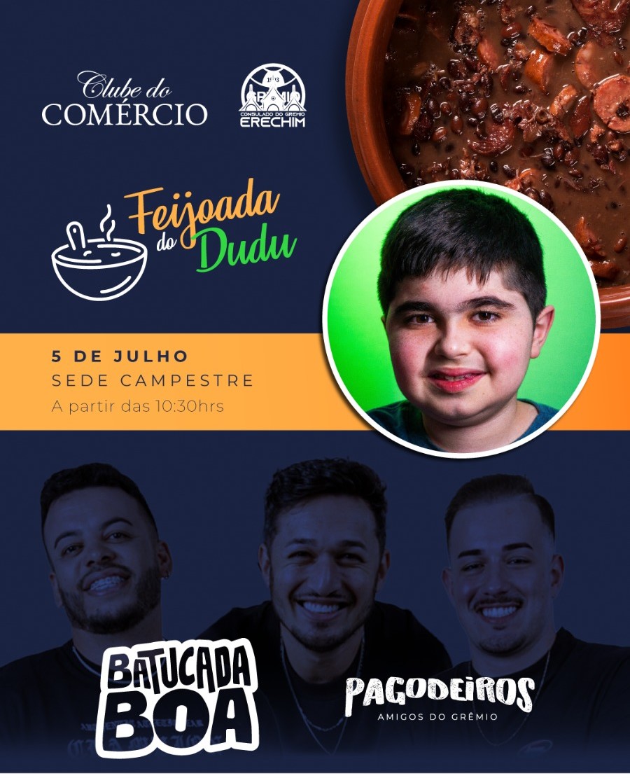 Além do tradicional prato brasileiro, o evento contará com a animação dos grupos Batucada Boa e Pagodeiros Amigos do Grêmio, que garantem um clima de alegria e confraternização. A iniciativa é uma realização conjunta do Clube do Comércio e do Consulado do Grêmio de Erechim, que uniram forças para promover a ação solidária.