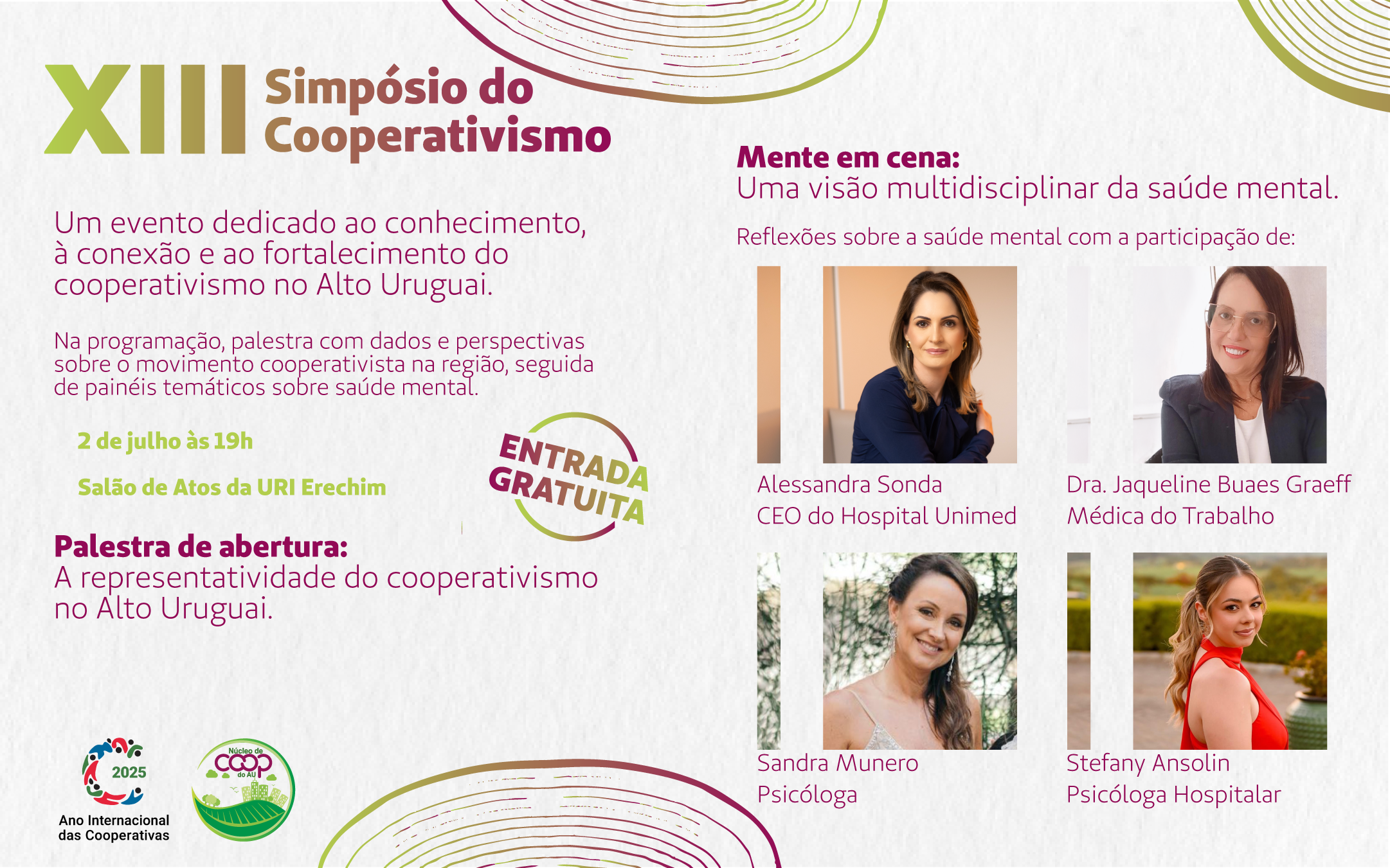 Em alusão ao Ano Internacional das Cooperativas, o Núcleo das Cooperativas do Alto Uruguai realiza o XIII Simpósio do Cooperativismo, reforçando o compromisso do movimento cooperativista com o desenvolvimento social e humano. O evento será realizado no dia 2 de julho, às 19h, no Salão de Atos da URI Erechim e tem como tema central “Mente em Cena – Uma visão multidisciplinar da saúde mental”.