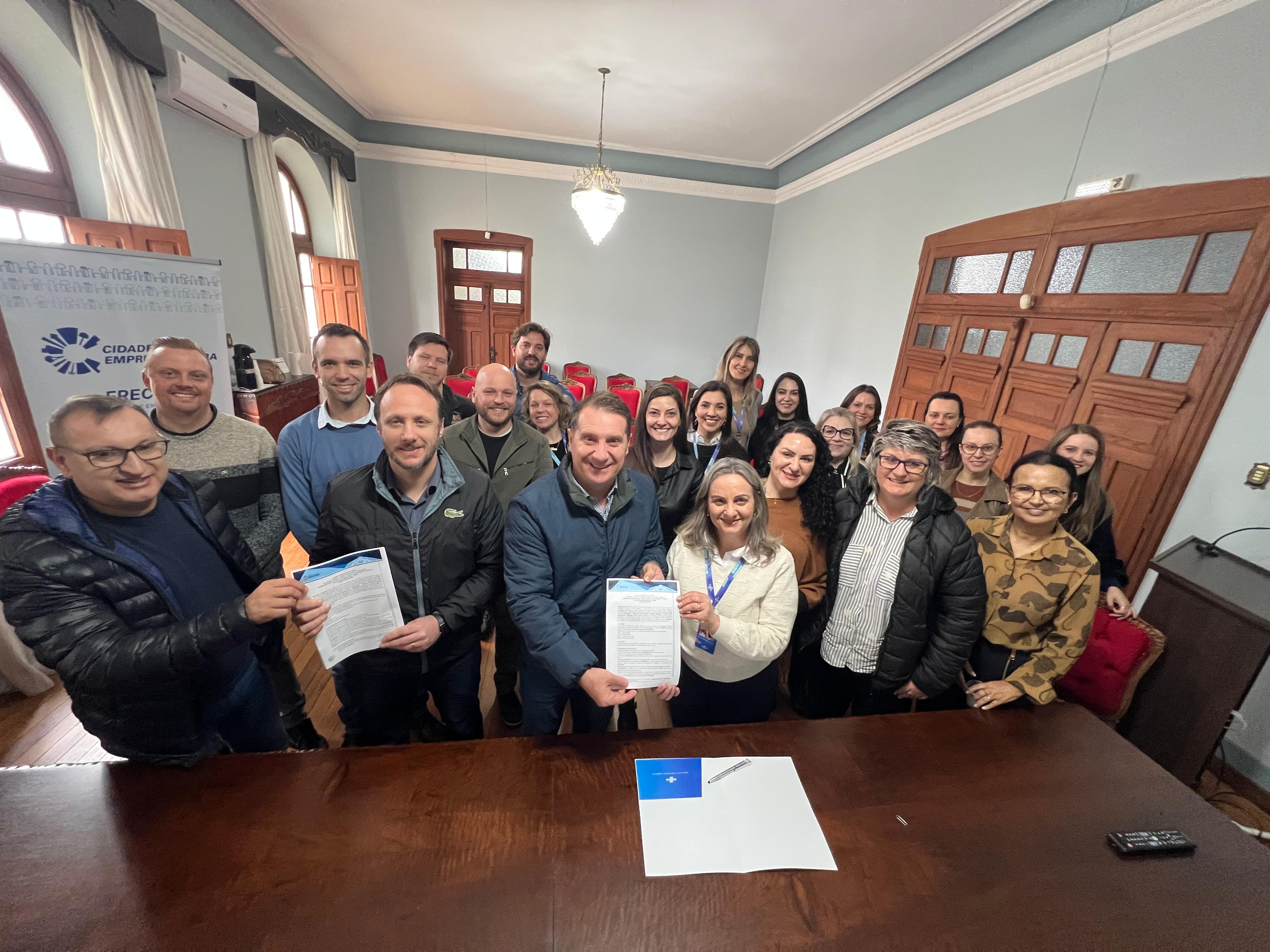 A Prefeitura de Erechim assinou, na manhã de segunda-feira (8), contrato com o Sebrae. O ato, realizado no Salão Nobre, contou com a presença do prefeito Paulo Polis, do vice-prefeito Flávio Tirello, secretários municipais, da gerente da Regional Norte do Sebrae, Silvana Conterato Berguemmaier, e técnicos da instituição.