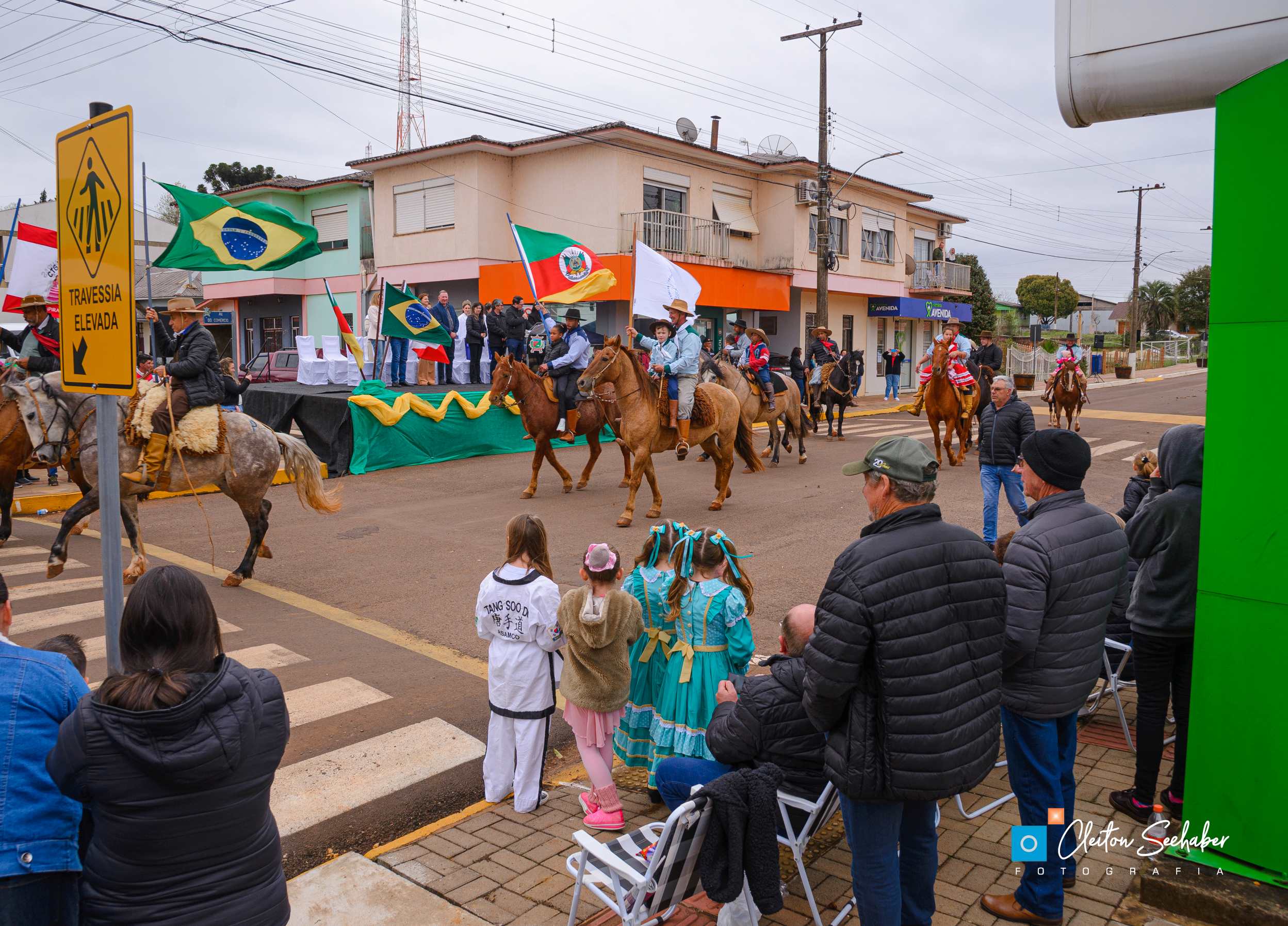 Na parte final do evento, cavaleiros conduziram a Chama Crioula, ato que marcou oficialmente o início das festividades farroupilhas no município, reforçando o vínculo entre o civismo e as tradições gaúchas.