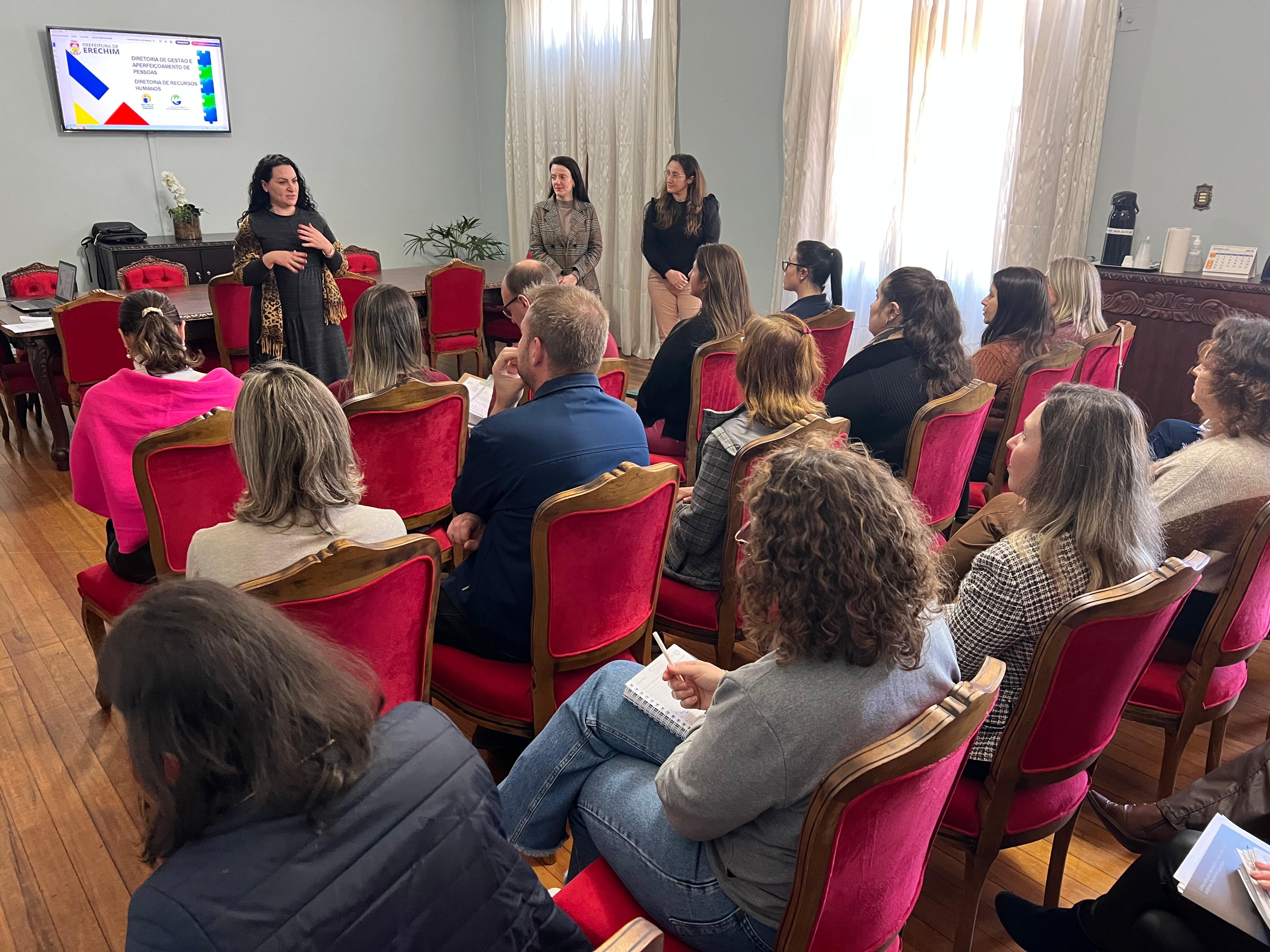 Na tarde de quarta-feira (10), o Salão Nobre da Prefeitura de Erechim sediou mais uma atividade voltada ao fortalecimento do funcionalismo público. A Diretoria de Gestão e Aperfeiçoamento de Pessoas, em conjunto com a Diretoria de Recursos Humanos, promoveu uma capacitação que tratou de temas que dizem respeito a recentes alterações na legislação dos servidores públicos.
