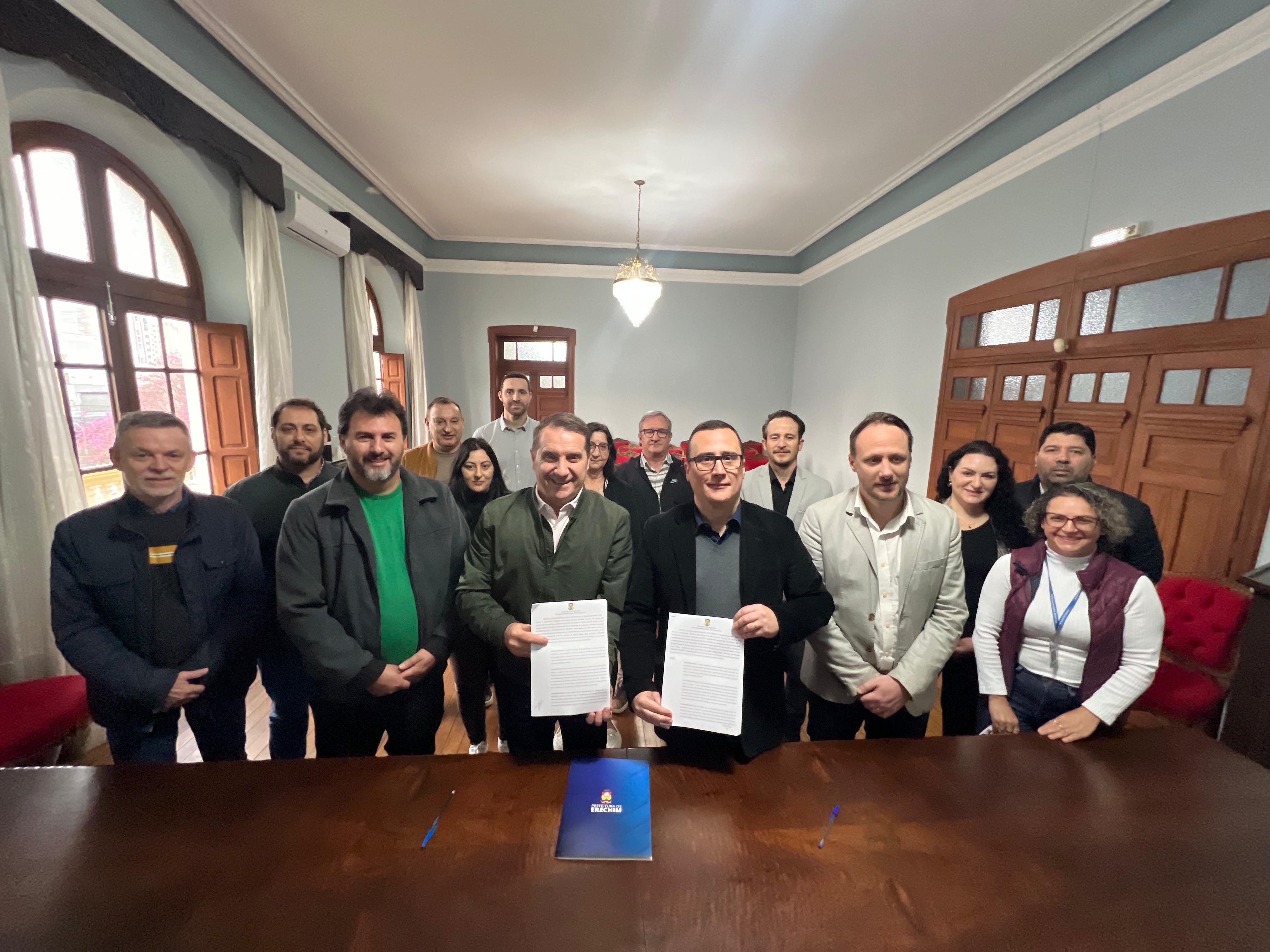 Na manhã desta segunda-feira (15), no Salão Nobre da Prefeitura, foi assinada a repactuação do Termo de Ajustamento de Conduta (TAC) referente às áreas verdes de Erechim. O ato contou com a presença do prefeito Paulo Polis; do vice-prefeito, Flávio Tirello; do promotor de Justiça Fabrício Gustavo Allegretti, do secretário de Meio Ambiente, Cristiano Moreira; do secretário de Gestão e Governança, Edgar Marmentini; do secretário de Planejamento, Mobilidade Urbana e Segurança Pública, Jacksin Arpini; do secretário de Obras Públicas e Habitação, Mario Rossi; dos procuradores municipais, Daniel Grossi e Rogério Aguilar; além da comissão técnica do REURB.