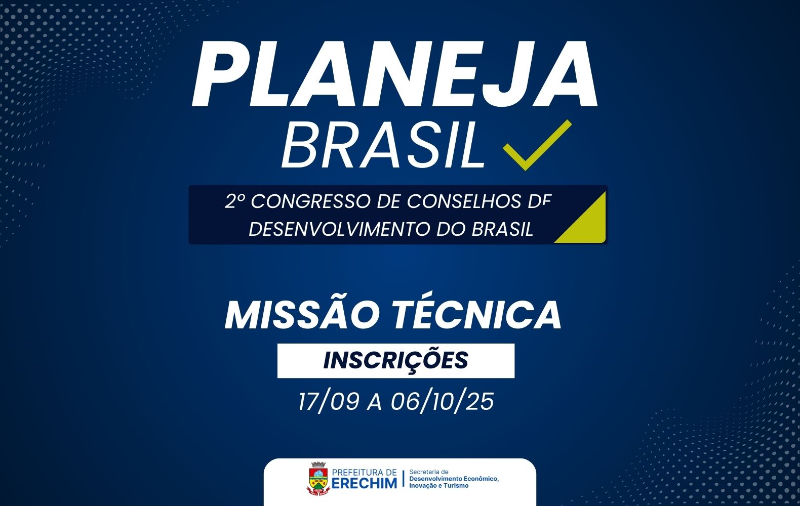 A Prefeitura de Erechim, por meio da Secretaria Municipal de Desenvolvimento Econômico, Inovação e Turismo, abriu nesta quarta-feira (17) as inscrições para a Missão Técnica ao Planeja Brasil 2025, que acontecerá nos dias 21 e 22 de outubro, em Maringá/PR. Clique aqui e confira os detalhes do Chamamento Público.