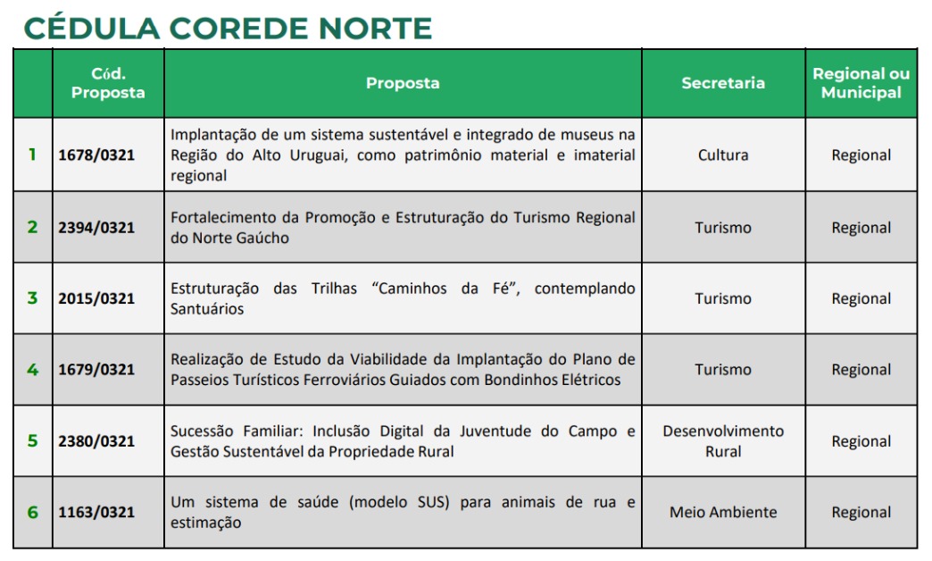 Fortalecimento da Promoção e Estruturação do Turismo Regional do Norte Gaúcho (Turismo);