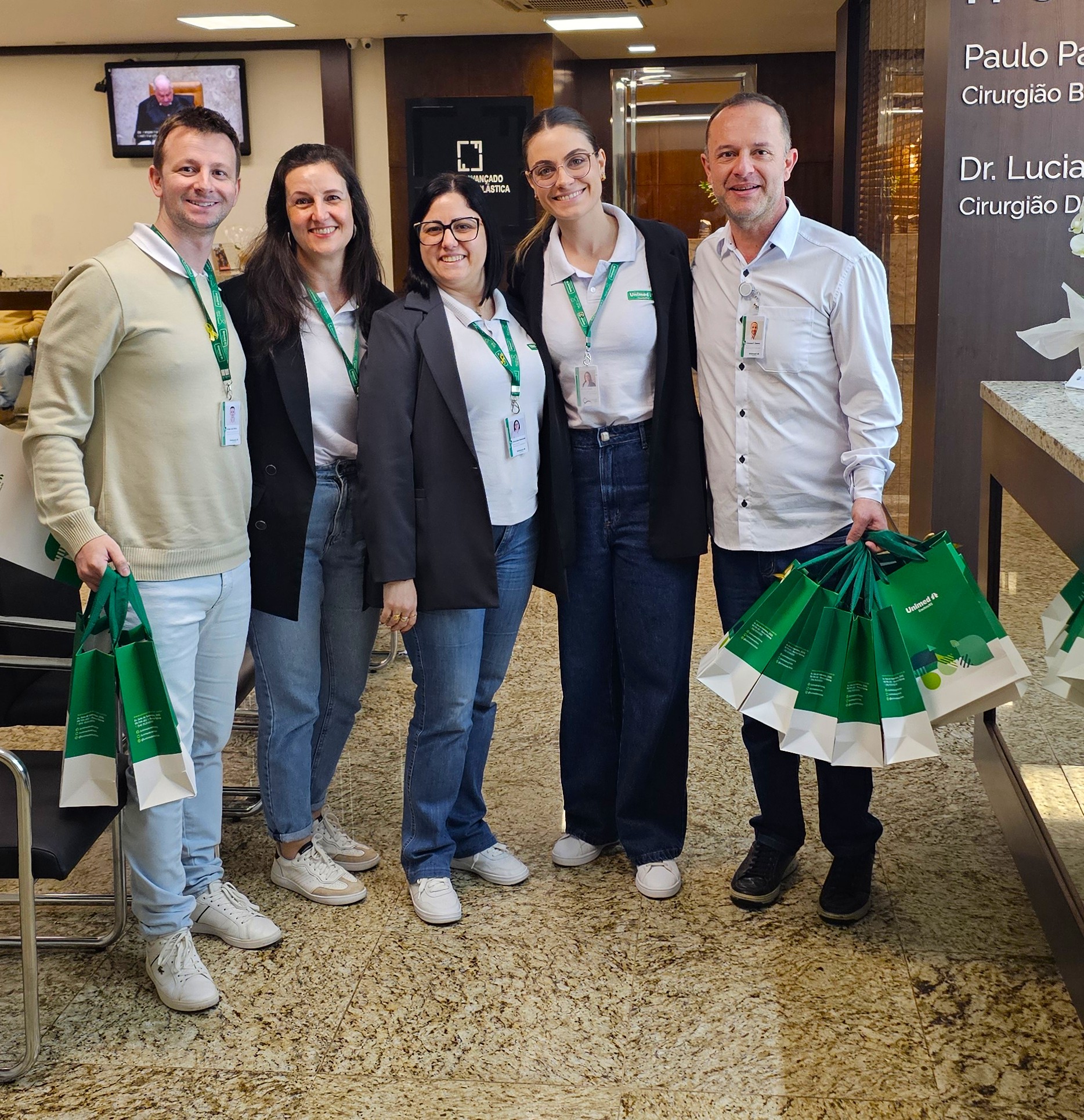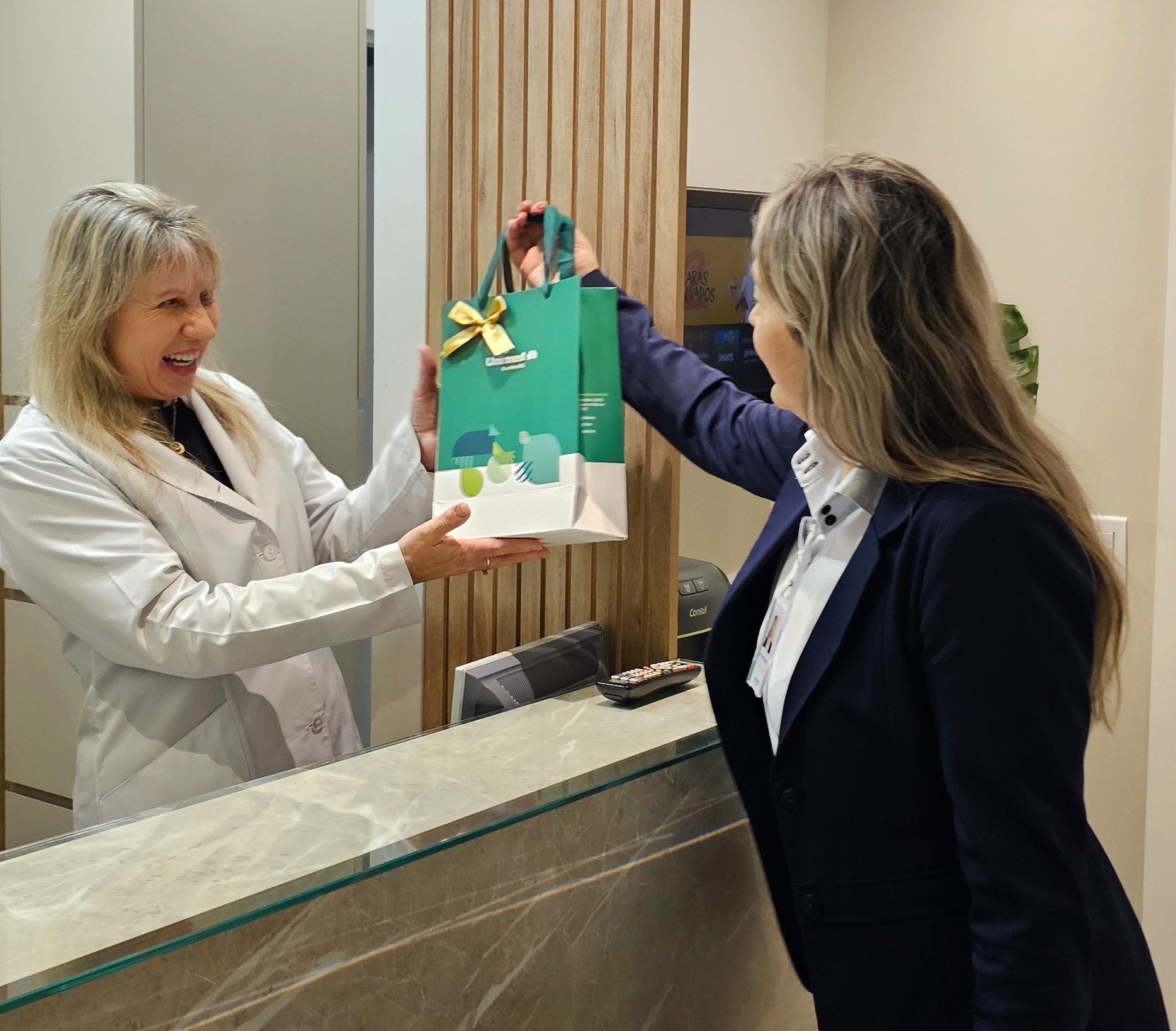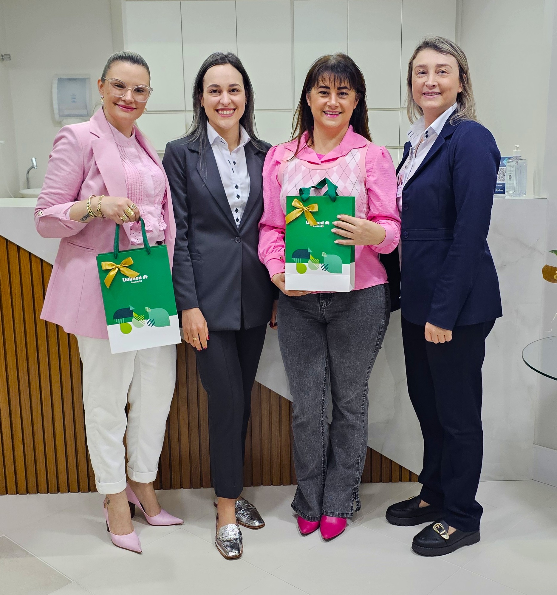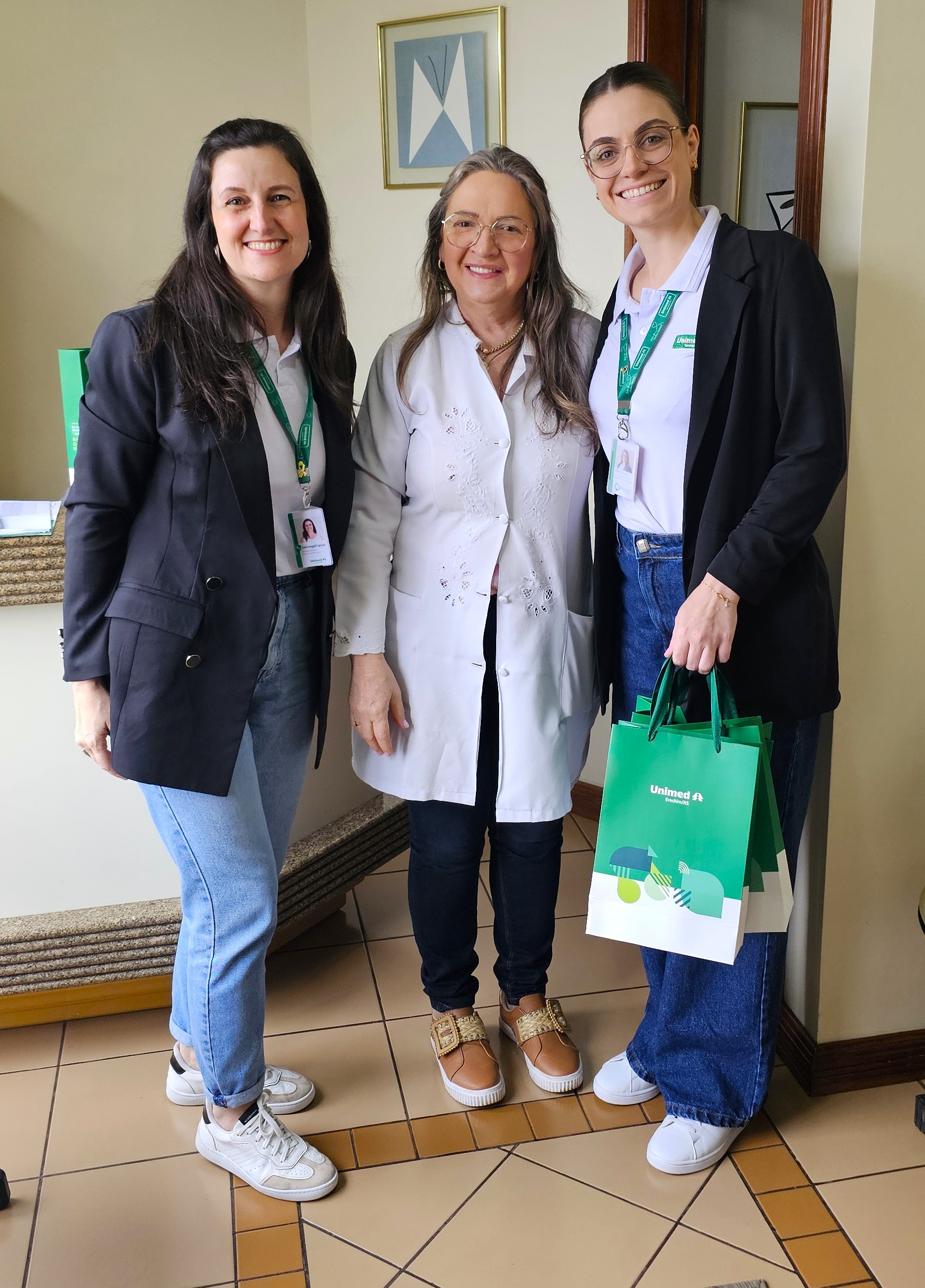 A entrega dos presentes foi realizada pelos supervisores dos Serviços Próprios da Unimed Erechim: Hospital, Laboratório de Análises Clínicas, Medicina Preventiva, Clínica de Fisioterapia e Centro de Diagnóstico por Imagem, além da Gestão do Relacionamento com o Paciente e Relacionamento com o Cooperado. Eles percorreram os consultórios e centros clínicos do município para homenagear pessoalmente as secretárias, reforçando a proximidade e o reconhecimento pelo importante trabalho que realizam diariamente.