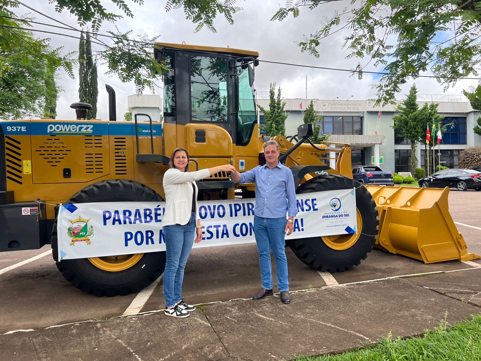A entrega foi feita pelo prefeito Marco Antonio Sana e pela vice-prefeita Luciana Folle, que repassaram o equipamento ao secretário de Obras, Eloir Pegoraro, e ao operador responsável pelo maquinário. A nova carregadeira deve ampliar a capacidade operacional da pasta, agilizando serviços essenciais como manutenção de estradas, movimentação de materiais, apoio a obras públicas e demais demandas da comunidade.