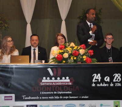 Conforme é tradição da Semana Acadêmica de Odontologia, a ABO (Associação Brasileira de Odontologia) costuma prestar uma homenagem a um profissional da área. O homenageado deste ano foi cirurgião-dentista Jackson Luis Arpini. A representante da ABO/Erechim, Tânia Zunkowski de Carvalho, conduziu a homenagem salientando o grande trabalho social que vem sendo desenvolvido por Jackson Arpini. “É pela dedicação à saúde pública e ao ser humano que estamos prestando essa homenagem. Saliento também que a bandeira do nosso homenageado é a saúde e o seu partido é o Banco de Sangue de Erechim”, frisou Tânia. “Portanto, nada mais justo do que homenagear àquele que liderou muitas ações na área da saúde bucal e da saúde em geral, assim como a produção da cartilha de prevenção às drogas e pela paz, que já está na quarta edição”, destacou.