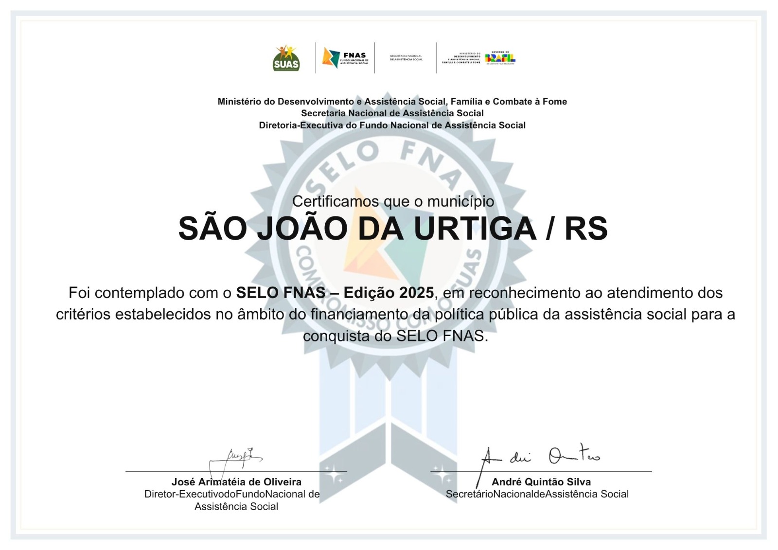 A honraria coloca São João da Urtiga em um grupo de cidades brasileiras que cumprem integralmente as diretrizes do Sistema Único de Assistência Social (SUAS). Assim, além de representar um reconhecimento burocrático, o selo funciona como aval de transparência e eficiência na aplicação dos recursos públicos destinados ao bem-estar social.