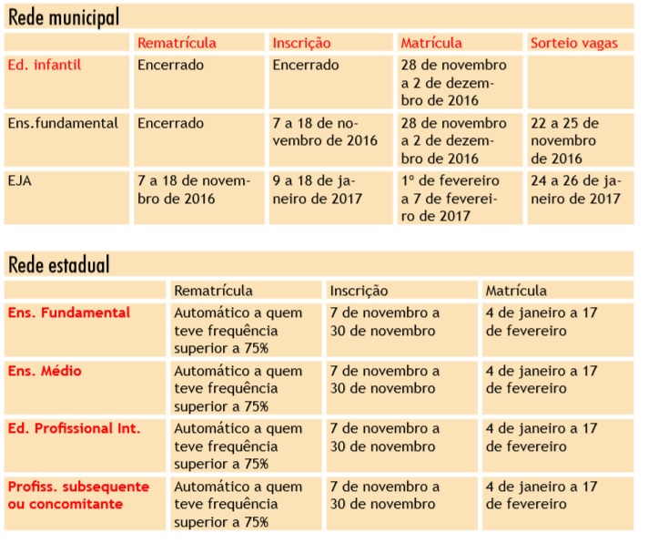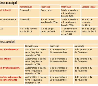 Já para a educação infantil e a Educação de Jovens e Adultos (EJA) o período de inscrições inicia apenas em 4 de janeiro e se estende até 17 de fevereiro de 2017, diretamente na secretaria das escolas.