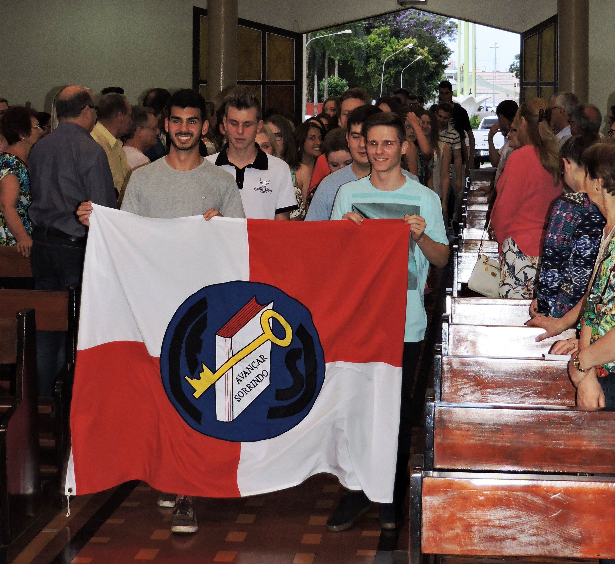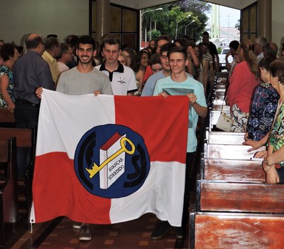 Em procissão os estudantes adentraram a igreja carregando a bandeira do colégio com os dizeres “Avançar sorrindo”. A diretora do Colégio, Ir. Silvana Arboit, fez a mensagem de acolhida lembrando o motivo da celebração, que por meio de preces e cânticos teve a finalidade de dar graças por mais uma etapa vencida pelos estudantes e seus familiares, direção, coordenação e educadores.