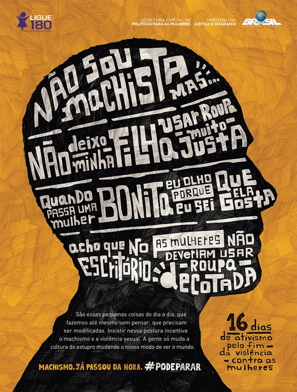 Desde 2003, o Brasil participa da campanha mundial “16 Dias de Ativismo pelo Fim da Violência Contra a Mulher”. Neste ano, o tema da campanha “Machismo. Já passou da hora” faz um alerta sobre pequenas atitudes do cotidiano que levam ao desrespeito à mulher. O governo federal pretende levantar o debate e a reflexão para diferentes formas de agressões e contextos que podem desencadear violências mais graves contra as mulheres.