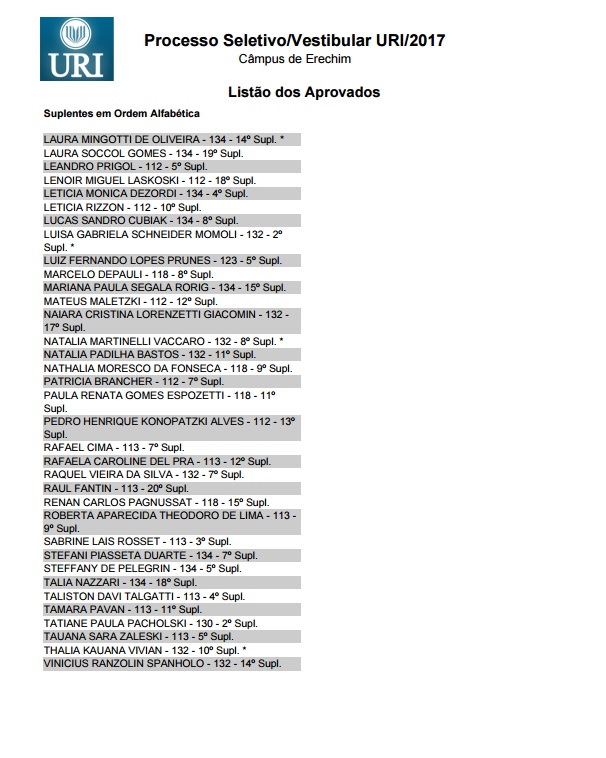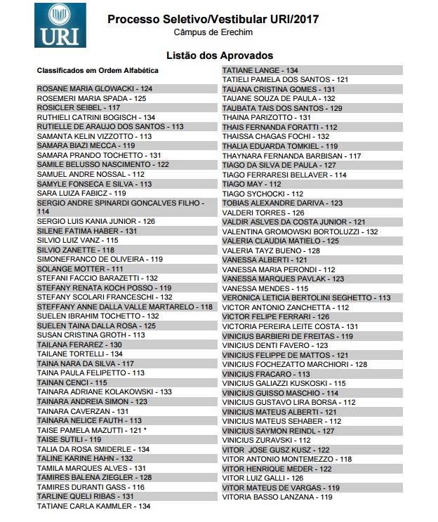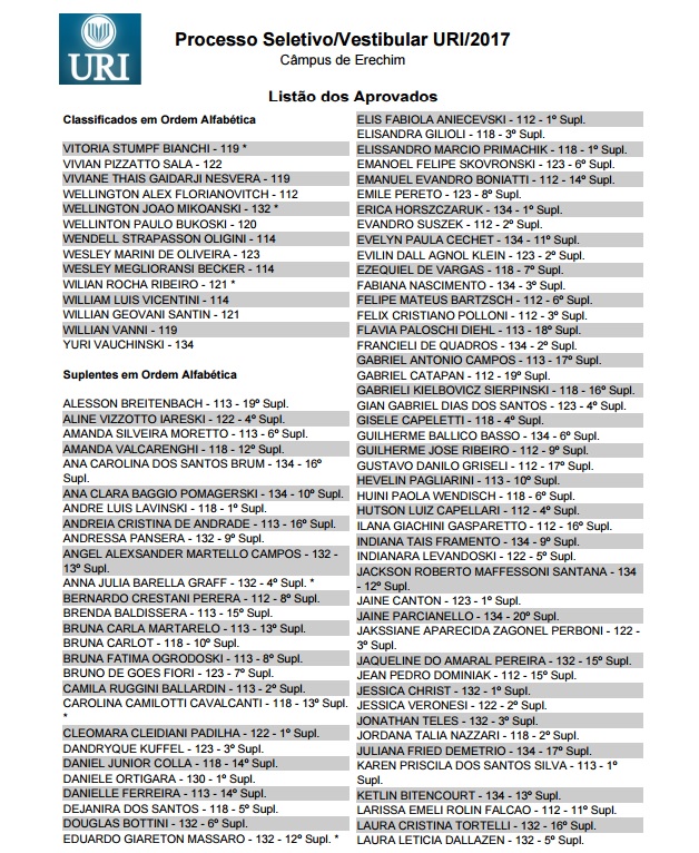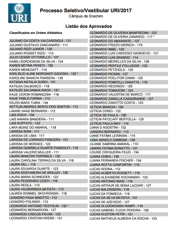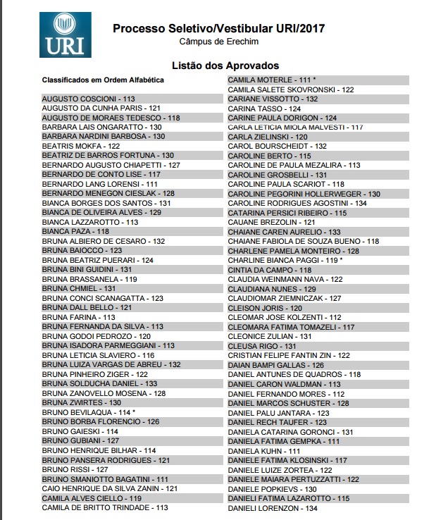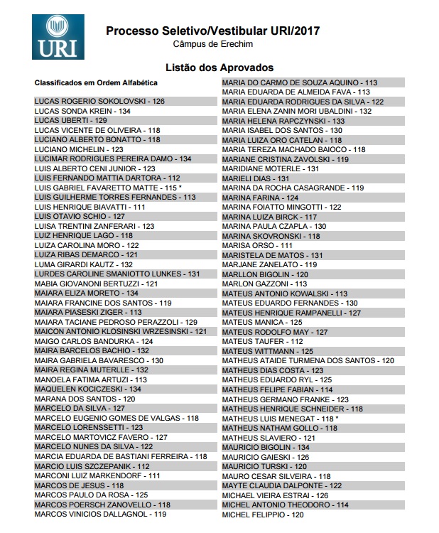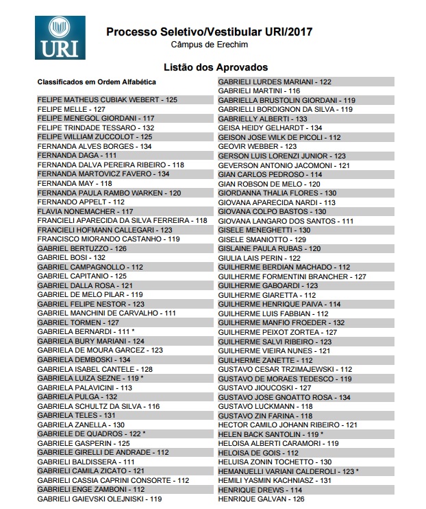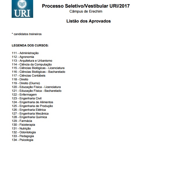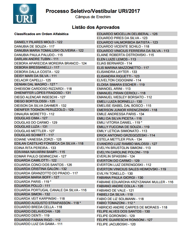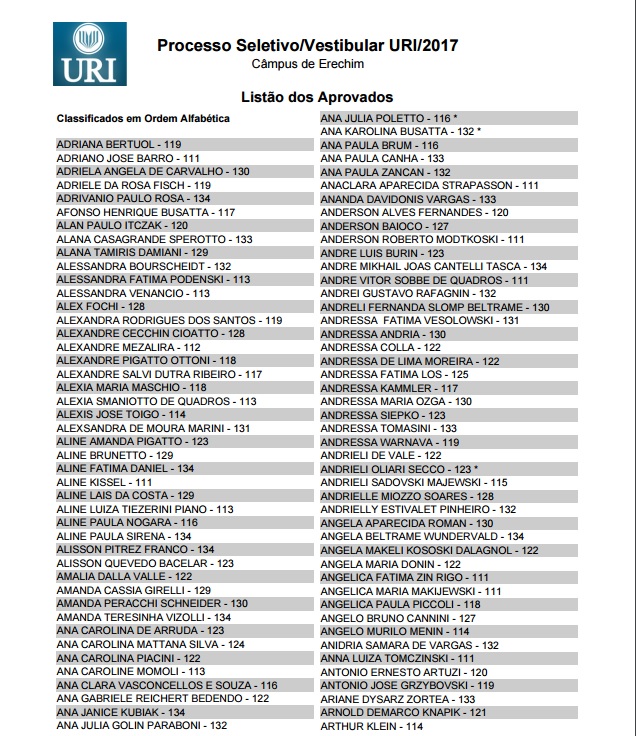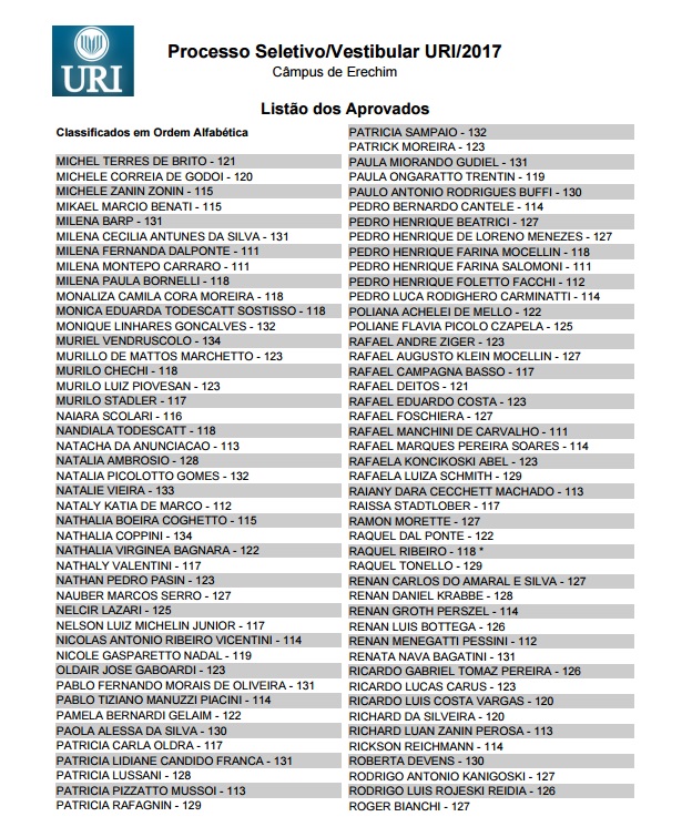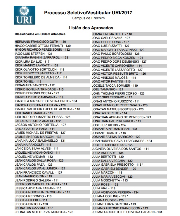 A URI (Universidade Regional Integrada) divulgou hoje a lista dos aprovados no Vestibular de Verão, realizado na tarde de domingo, 27, e que mobilizou 1,2 mil candidatos das regiões norte, nordeste, de outras partes do Estado e também de Santa Catarina. Entre os aprovados nos 23 cursos oferecidos estão também os que fizeram uma prova especial destinada aos que possuem acima de 35 anos de idade. Confira a lista dos aprovados no câmpus de Erechim.