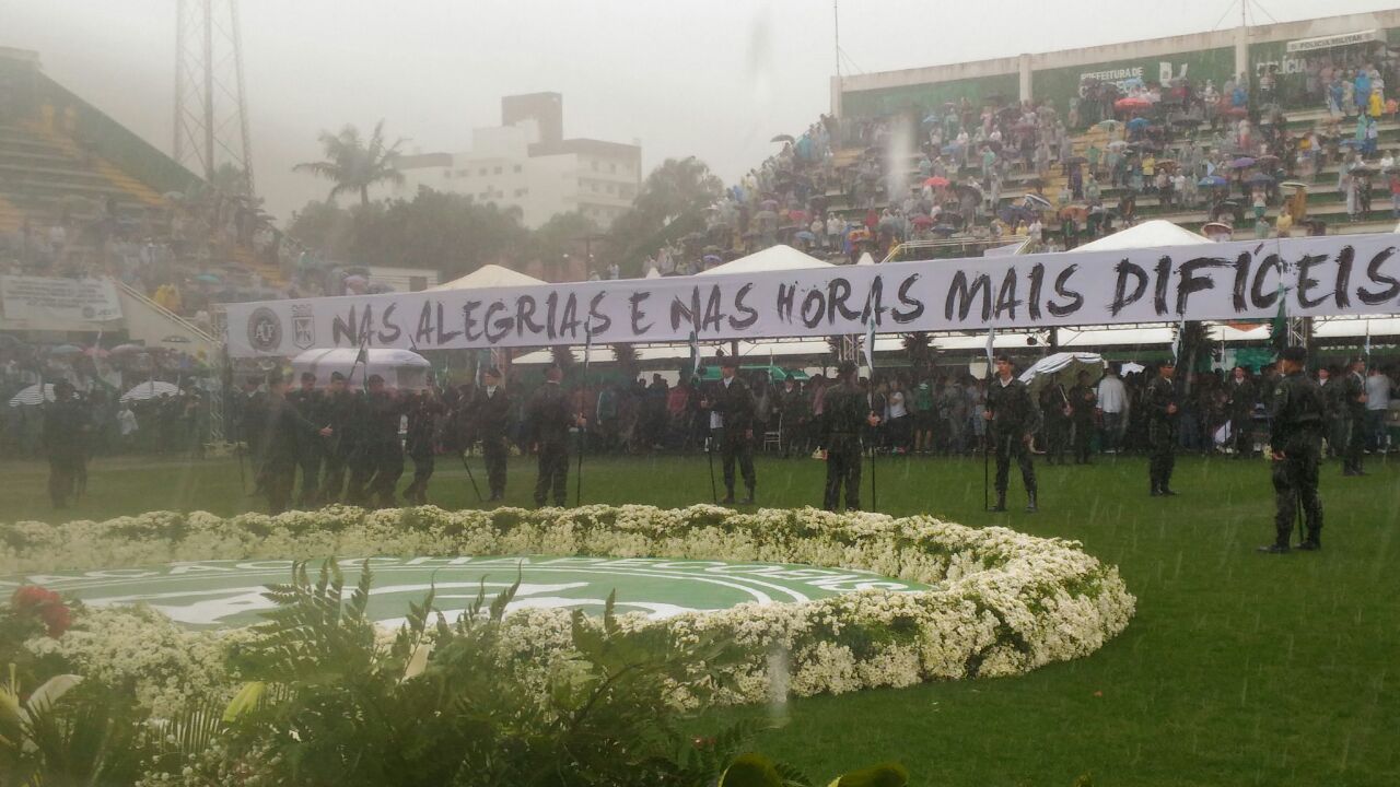 "Os guerreiros"mortos no desastre aéreo na Colômbia, recebem as homenagens finais na Arena Condá. Após a execução do Hino Nacional,o vice presidente Ivan Tozzo abriu os pronunciamentos e conclamou o torcedor para continuar ajudando a "Chape". Tozzo também afirmou que a "Chape" vai continuar e que entre os exemplos deixados pelos mortos está o de que não há limites para sonhar.