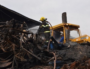 Toneladas de bodas de borracha, lonas plásticas e linhas de lylon formam uma gigantesca montanha de entulho no pátio da empresa