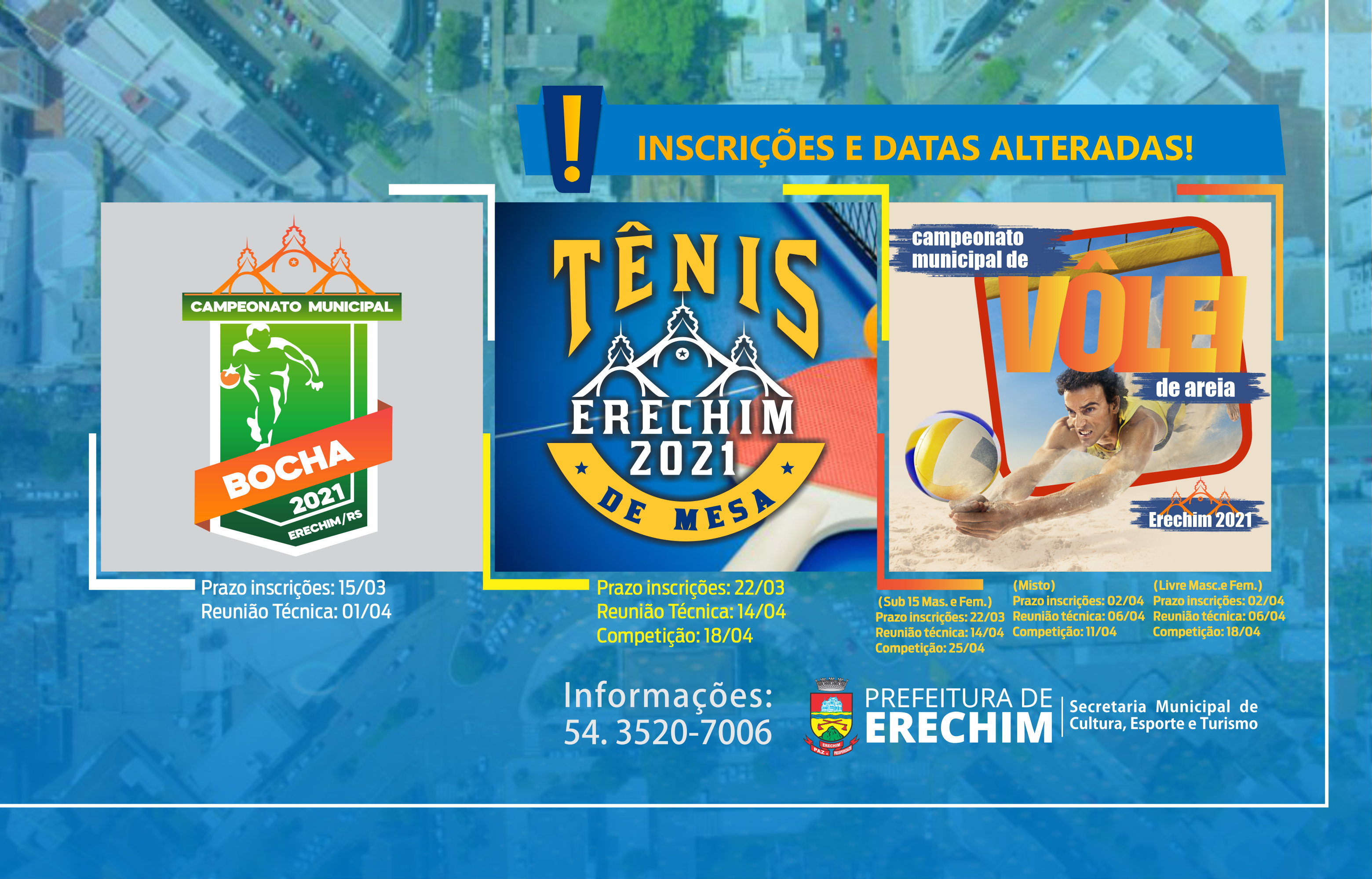 As fichas de inscrições podem ser encaminhadas para o e-mail smcet.esporte@erechim.rs.gov.br ou entregues no Setor de Protocolo da Prefeitura de Erechim