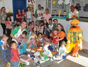 Acompanhados do Canarinho, a doação aconteceu para as crianças da Escola Vera Sass